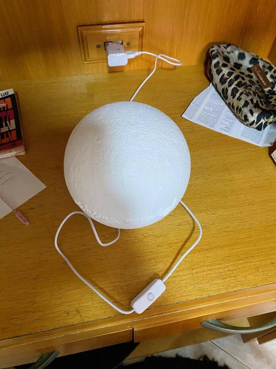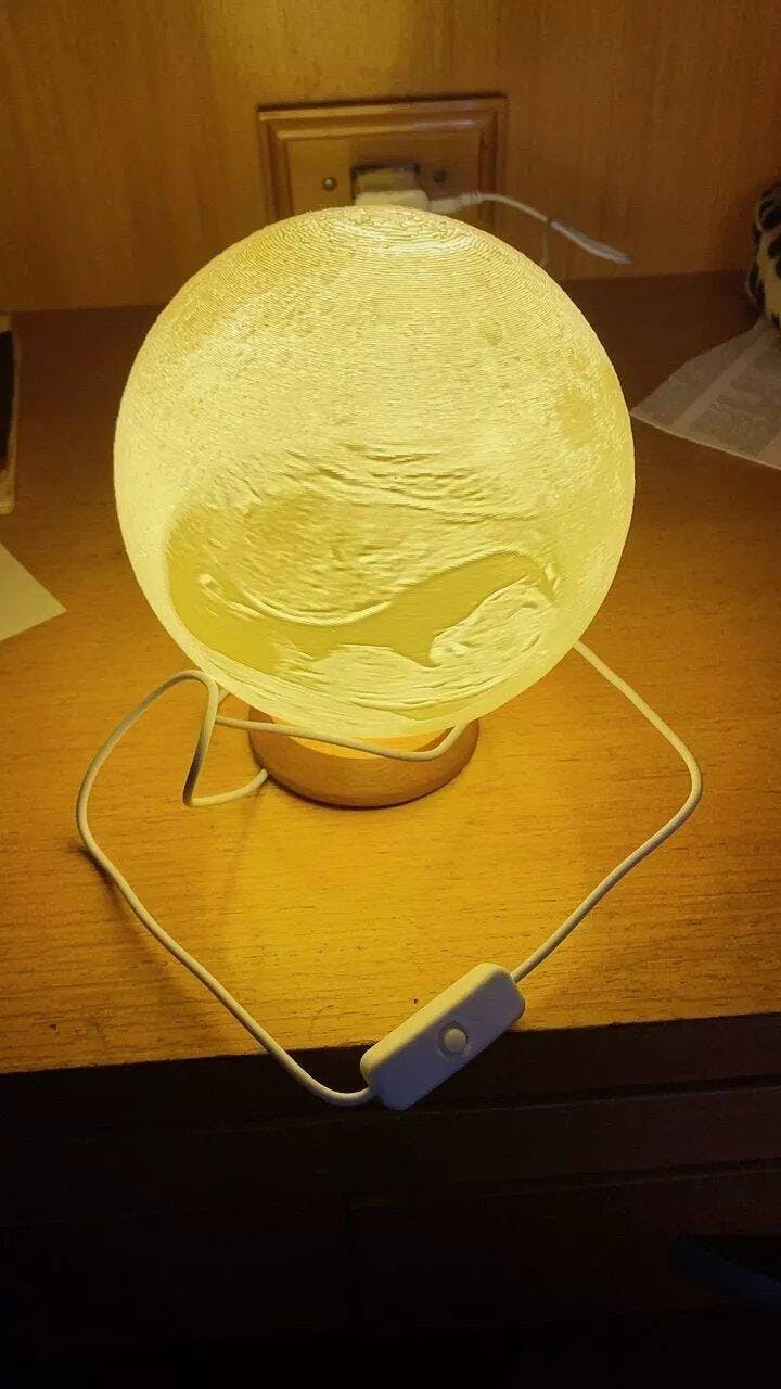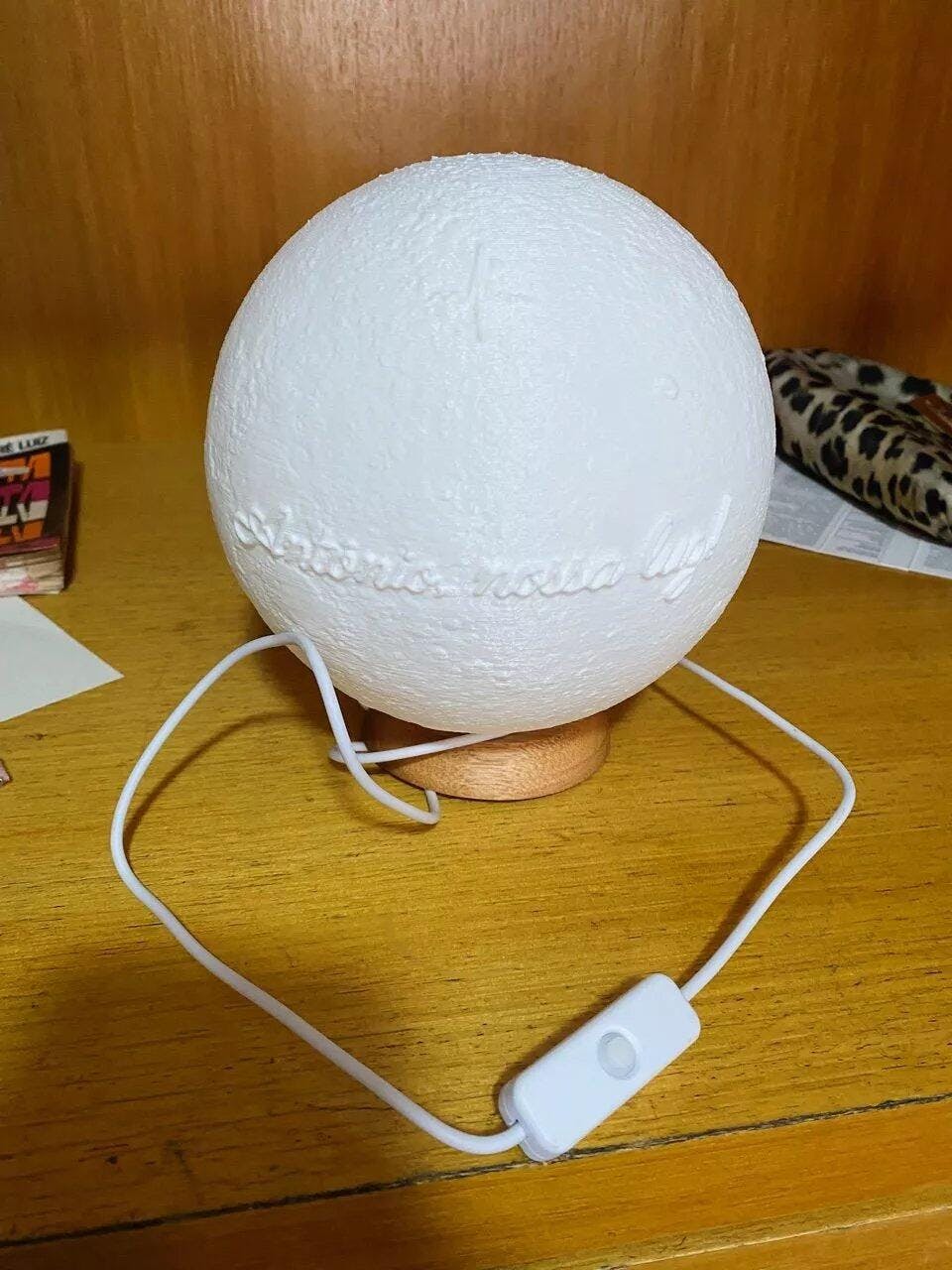 | Material | Base LED em madeira nobre (tratada e acabada) + LUA feita em filamento 3D PLA |
